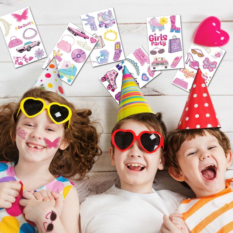 - ⚡Pink Girls Tattoos for All Occasions -- These awesome tattoos can be used in various occasions, such as birthday party supplies, party decorations, retro pink party favors, party bags, DIY decorations, pool and the beach or gift for kids and rewards. Kids temporary tattoos are the best party favors and goodie bags fillers ever for any kind of celebration!