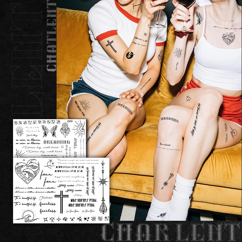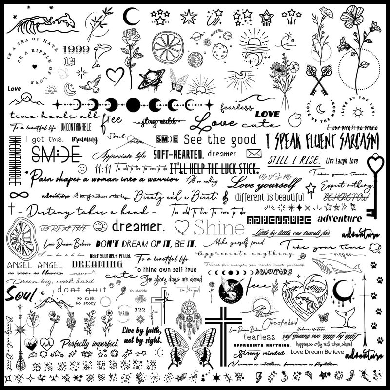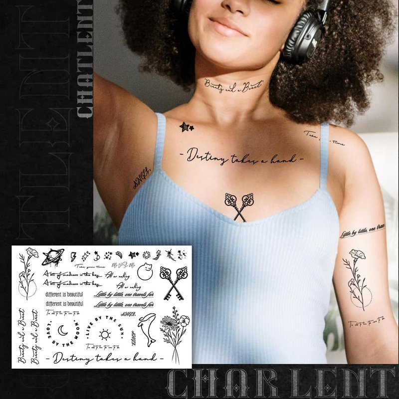 - ⚡Awesome Realistic Temporary Tattoos for Adult-- Super stylish design temporary tattoos, set includes variety of sizes inspirational words tattoos tiny small tattoos that you can use for different locations on your shoulder, arms, chest, etc. Easy to share it with your family and friends.
