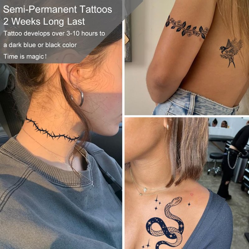 - ⚡High Quality Long-Lasting Womens Tattoos -- Semi-permanent tech, tattoo sits in your skin, not on top of it.The tattoos will take 5-24 hours to darken over the course on your skin. The semi-permanent tattoos can show your personality and express your ideas,guaranteed to dazzle,perfect for women girls to get noticed wherever you are.