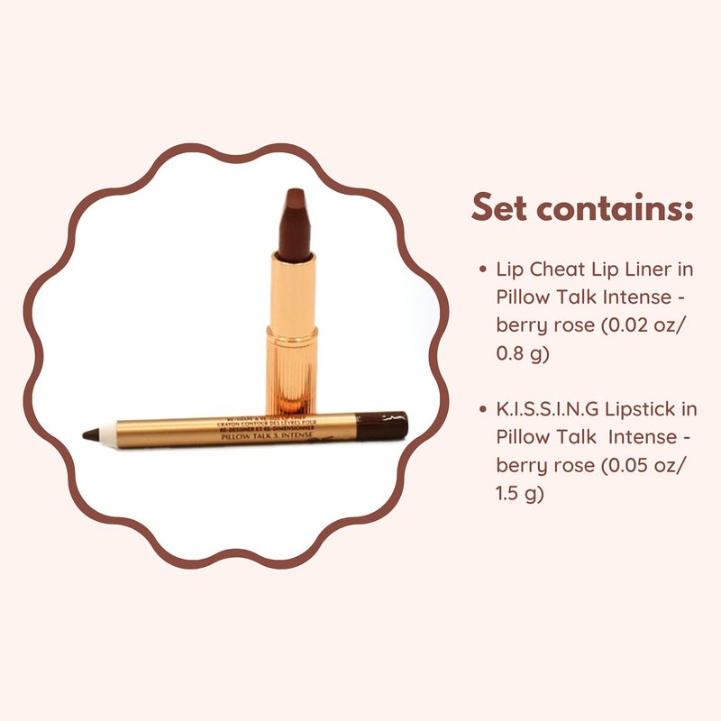 Charlotte Tilbury Mini Pillow Talk Lipstick & Liner Set Color: Pillow Talk Intense The set includes: - 0.02 oz/ 0.8 g Travel Size Lip Cheat Lip Liner in Pillow Talk Intense (warm berry pink)- 0.05 oz/ 1.5 g Travel Size K.I.S.S.I.N.G Lipstick in Pillow Talk Intense (warm berry pink)How to use:1. Resize and reshape the look of your lips with Lip Cheat lip liner in Pillow Talk Intense. Outline your lips starting from the top corner, drawing slightly over the outer edge of your natural lip line for a fuller-looking pout. Fill in the lips for added intensity.2. Apply Matte Revolution lipstick in Pillow Talk Intense straight from the bullet for a kissable, sumptuous finish.