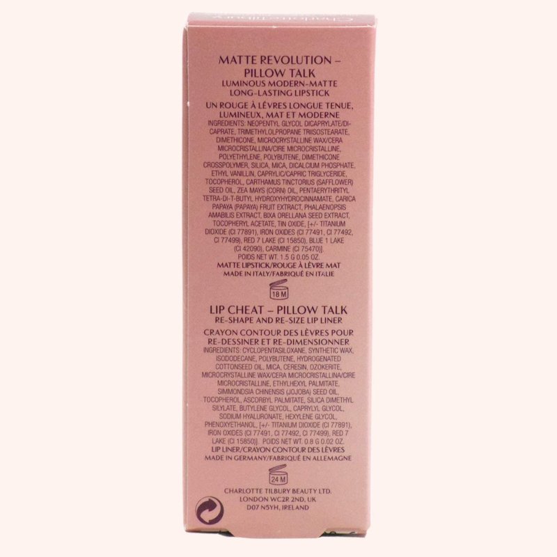- This Set Contains: - 0.02 oz/ 0.8 g Lip Cheat Lip Liner in Pillow Talk - 0.05 oz/ 1.5 g Matte Revolution Lipstick in Pillow Talk