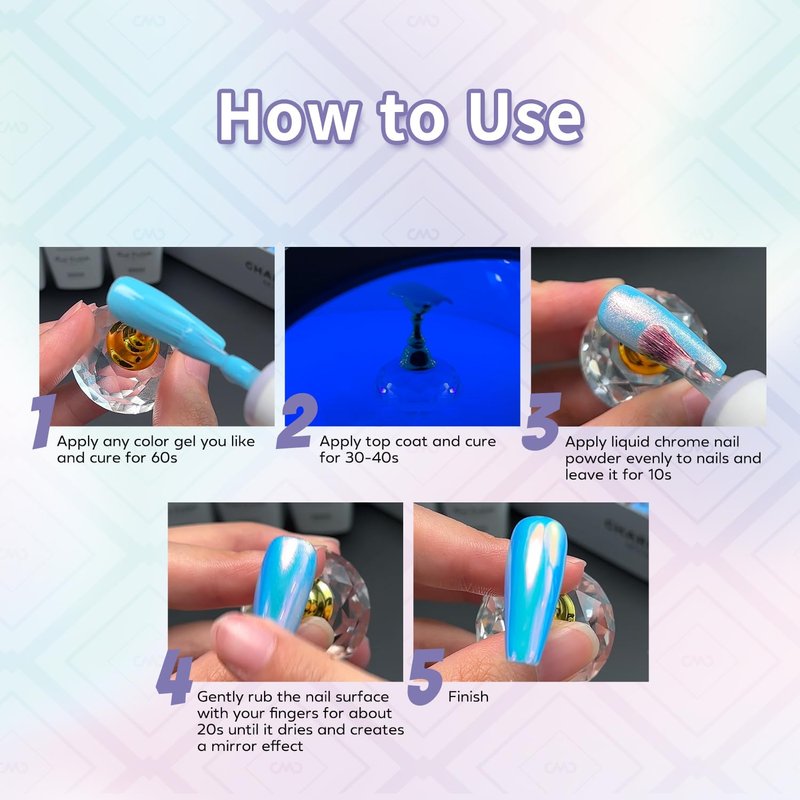 - New Formula & Mirror Effect: Compared with other mirror chrome powders, it is liquid and will not cause the powder to fly everywhere. Our liquid mirror chrome nail powder creates an excellent luster on your manicure, giving you a gorgeous mirror effect. Using chrome nail polish with the color gel in the set will give your nails a sparkle of magic, give it a try!