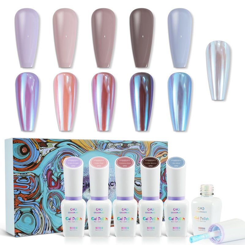 - What You Will Receive: CHARMACY fall color gel nail polish set contains 5*8ml gel nail polish in different charming colors such as Sky Blue, Light Purple, Light Pink, Cinnamon, Brown, and 1*8ml mirror liquid chrome nail powder.