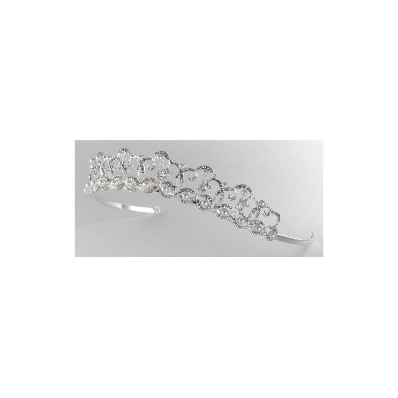 This charming bridal tiara of dangling teardrop rhinestones, pearls and rhinestone-encrusted scrolls is your ultimate headpiece for wedding, prom, quinceañera, and other special events. The ornamented section measures about 8 inches by 1 inches at tallest point. it coordinates with gown of white color or off-white color and has pin loops at both ends to help securing the piece to hair.