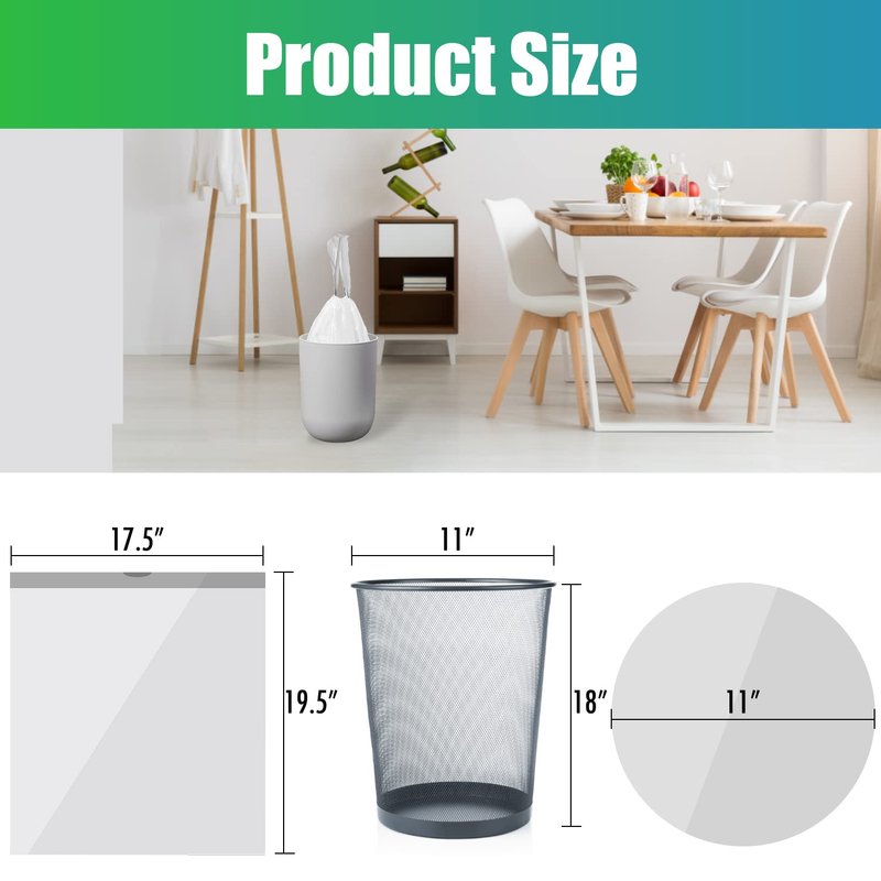 - 3-5 Gallon Capacity - The drawstring trash bags is suitable for 4 gallon trash can(10-15L). The size of 4 gallon garbage bags is 17.7” W x 19.7” H (45x50cm).