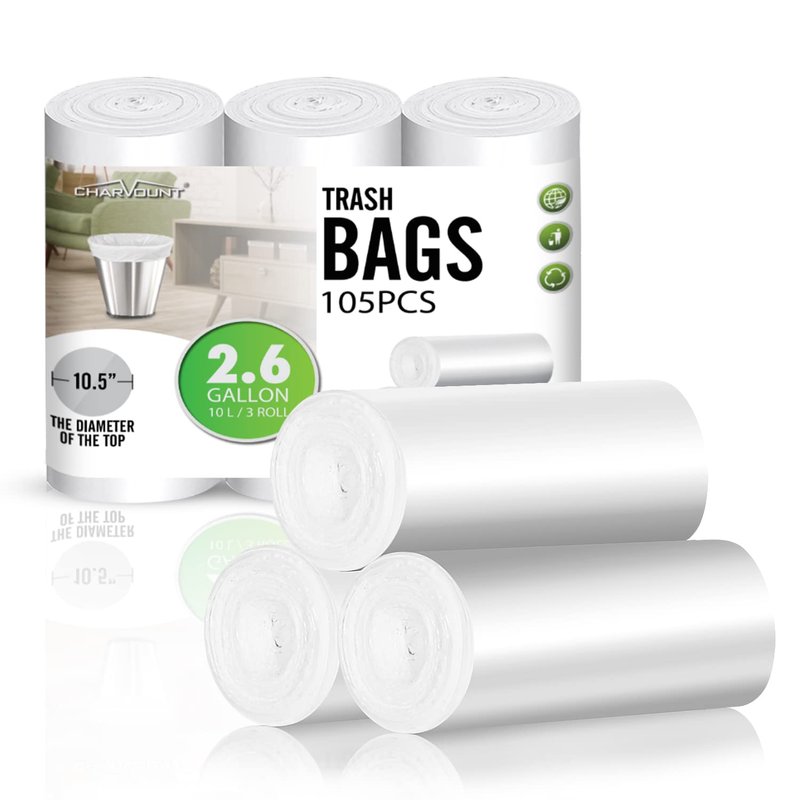 Charmount Small Trash Can Liners, Garbage Bags for Bathroom, Kitchen, Office, Bedroom, 2.6 Gallon, Unscented,105 Counts (White) …