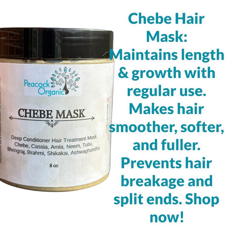 Our Chebe Hair Mask is handmade with potent blend of 13 essential Ayurvedic herbs, providing deep conditioning and moisturizing treatment for all hair types and textures. For centuries, Chad women have trusted chebe powder to strengthen and protect their hair. Packed with vital nutrients, antioxidants, and vitamins, this mask will leave your hair lustrous, soft, shiny, and strong. Why Choose Our Chebe Hair Mask? Nourishing & Strengthening: Infused with rosemary and peppermint, our mask deeply conditions while stimulating hair follicles, strengthening strands, and promoting healthy growth from root to tip. Retain Length & Repair Damage: Our Chebe Hair Mask drastically softens your hair while helping retain length. It also improves split ends and damage caused by heat, styling, or coloring. Soothing & Healing: This mask soothes and heals the scalp while locking in nutrients for shiny and healthy hair.