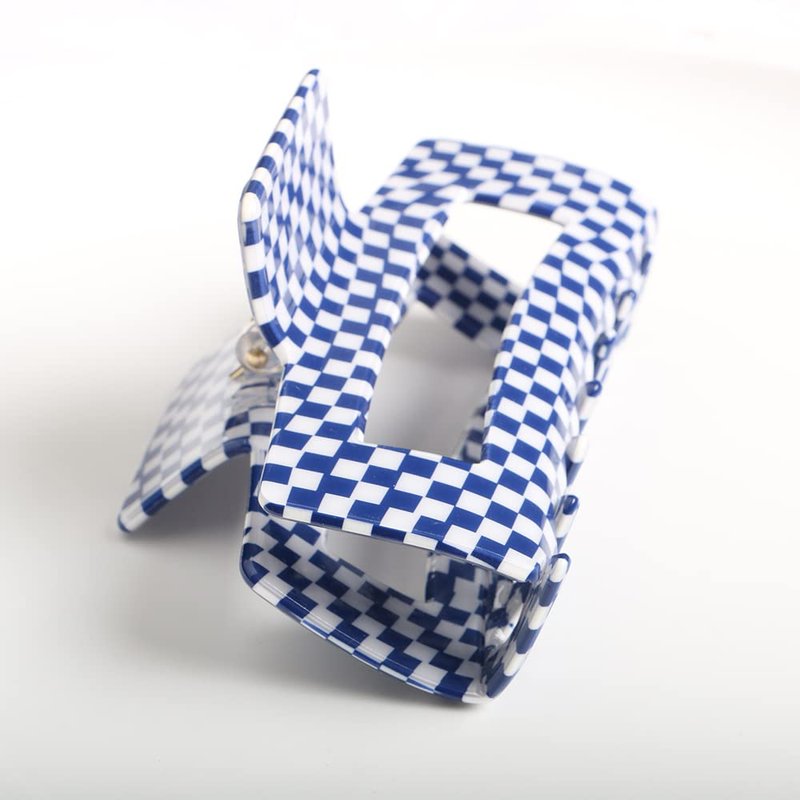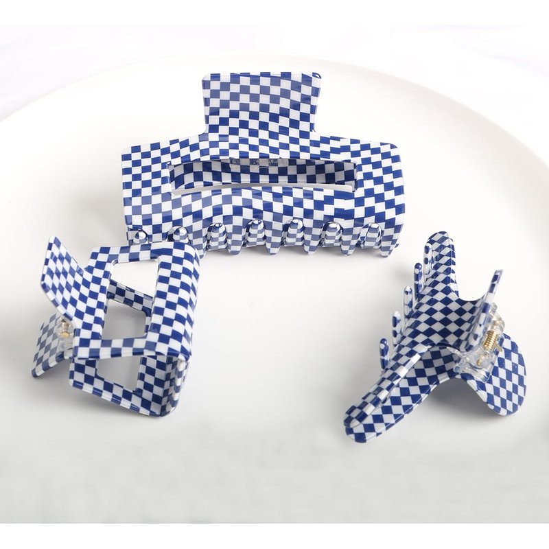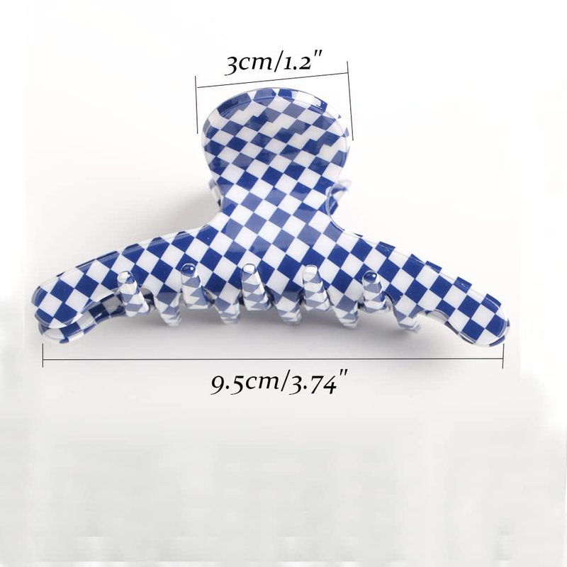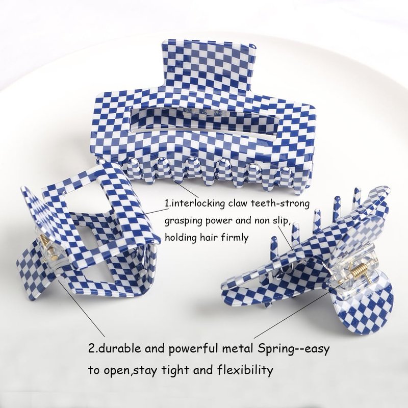 Checkered Hair Claw Clips,Pack of 3,Vintage Blue/White Checkered Claw Clips Cellulose Acetate Banana Clips,Nonslip Hair Clamp for Women Girls (Blue)