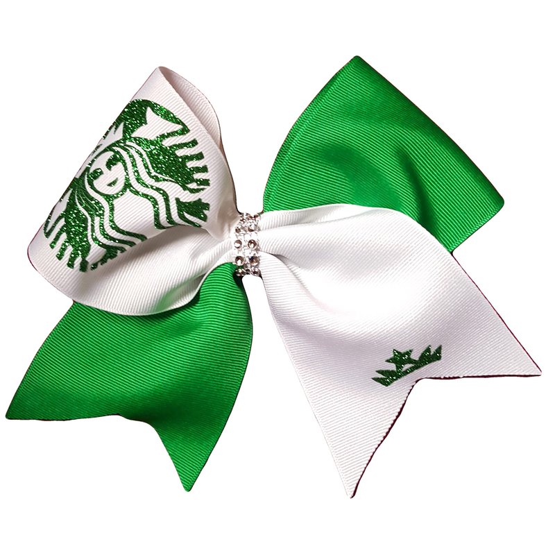 Cheer bows White and green Coffee shop lovers Glitter Bling Hair Bow