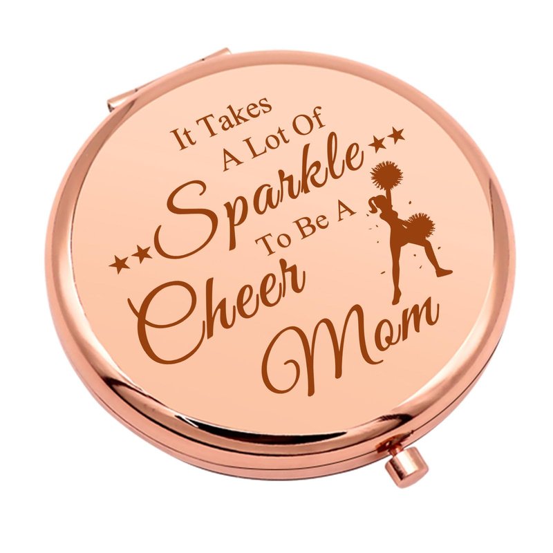 Appreciation Gifts for Cheerleading Coach: Looking for an intimate cheerleading coach gift to express your gratitude? This compact makeup mirror engraved with "It Takes A Lot Of Sparkle To Be A Cheer Mom" is a perfect gift for cheerleaders coach. Lovely way before expressing gratitude to the special cheerleader coach. Thank you Gift for Cheer Mom: Cheerleading Coaches Gift for birthday, competition party of every sports, retirement, graduation, back to school, end of season, cheer banquet, Father's Day, Mother's Day gifts, holiday, or just because. Specification Color :Rose Gold Size: 65mm(2.6 inch diameter) Material: Stainless Steel Features :Magnifying, Dual Sided Mirror Shape: Round Style :Fashion, Practical, Inspirational Gift Package Includes: 1 x Cheer Mom Appreciation Gift Folding Makeup Mirrors 1 x Nice Velvet Bag