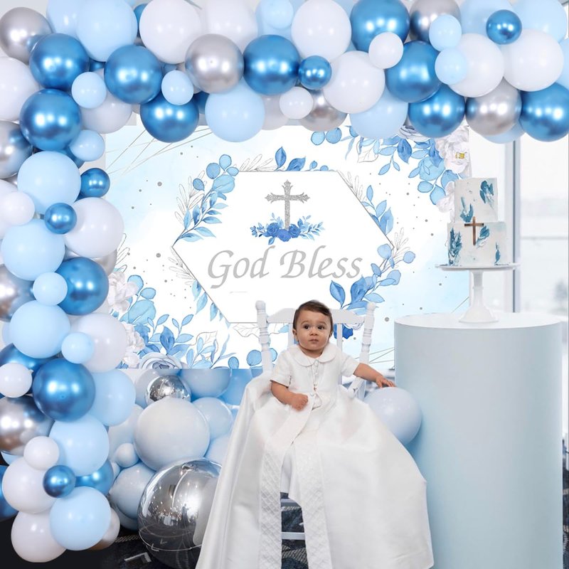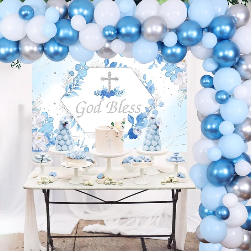 Cheereveal Baptism Party Decorations for Boys Blue, God Bless Party Decorations Blue and Silver Balloon Garland Kit with Backdrop Cross Foil Balloon for First Communion Confirmation Party Supplies