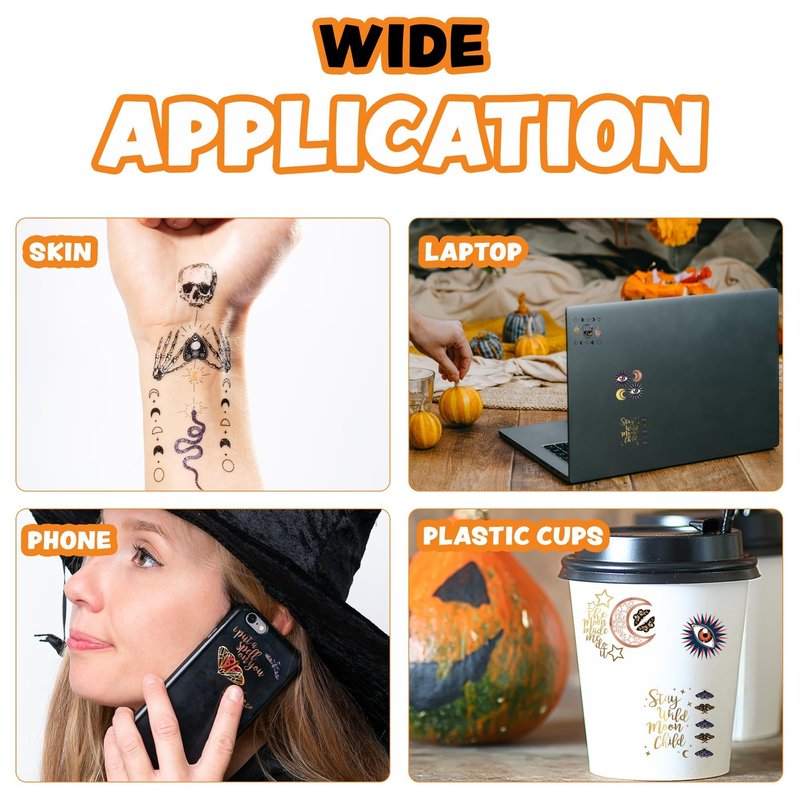 Crafted with high-quality materials, our Boho Halloween tattoos are meticulously printed to ensure vibrant colors and detailed designs. Each package includes 12 sheets of tattoos, providing you with a total of 108 unique tattoos. These tattoos are not only perfect for Halloween costumes but also versatile for other occasions. Apply them to your body for a temporary bohemian look or stick them on smooth objects like glass, tile, water bottles, plastic, phone cases, and more to enhance your party decorations.