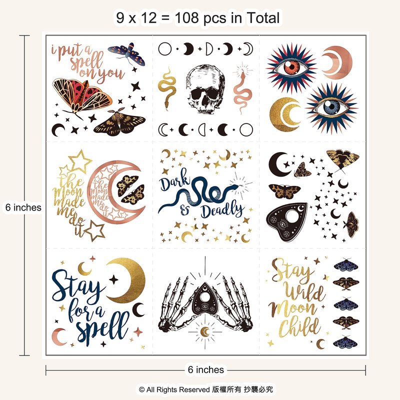 - [Package] : Our high-quality tattoos, measuring 2 inches by 2 inches each, are printed with utmost attention to detail and come with a convenient dash line for easy separation; Each sheet contains 9 tattoos total 12 sheets, providing a total of 108 unique tattoos for you to enjoy