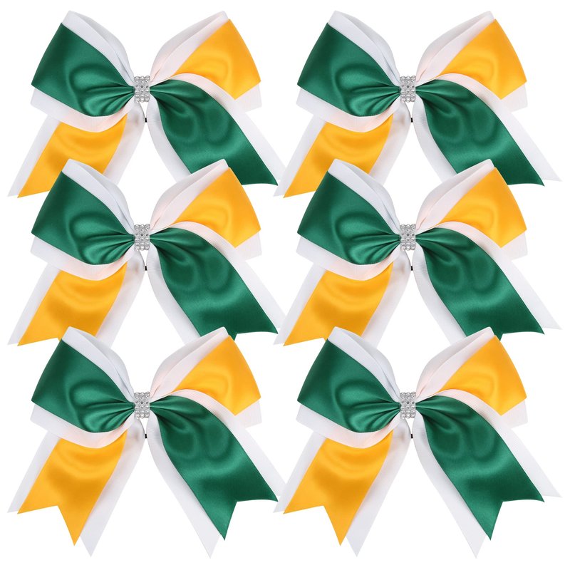 Cheerleader Bows 8 Inch 3 Colors 2 Layers 6 Pcs Jumbo Ponytail Holder Cheerleading Bows for High School College Hair Elastic Hair Tie (Forest Green/Gold)