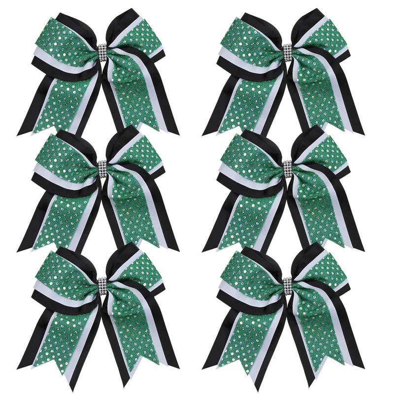 Cheerleader Bows 8 Inch 3 Layers 6 Pcs Ponytail Holder Jumbo Cheerleading Bows Hair Elastic Hair Tie for High School College (Black/White/Green)