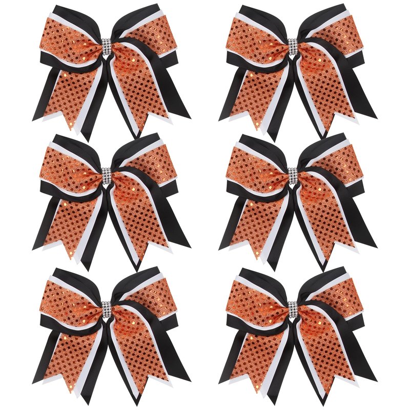 Cheerleader Bows 8 Inch 3 Layers 6 Pcs Ponytail Holder Jumbo Cheerleading Bows Hair Elastic Hair Tie for High School College (Black/White/Orange)
