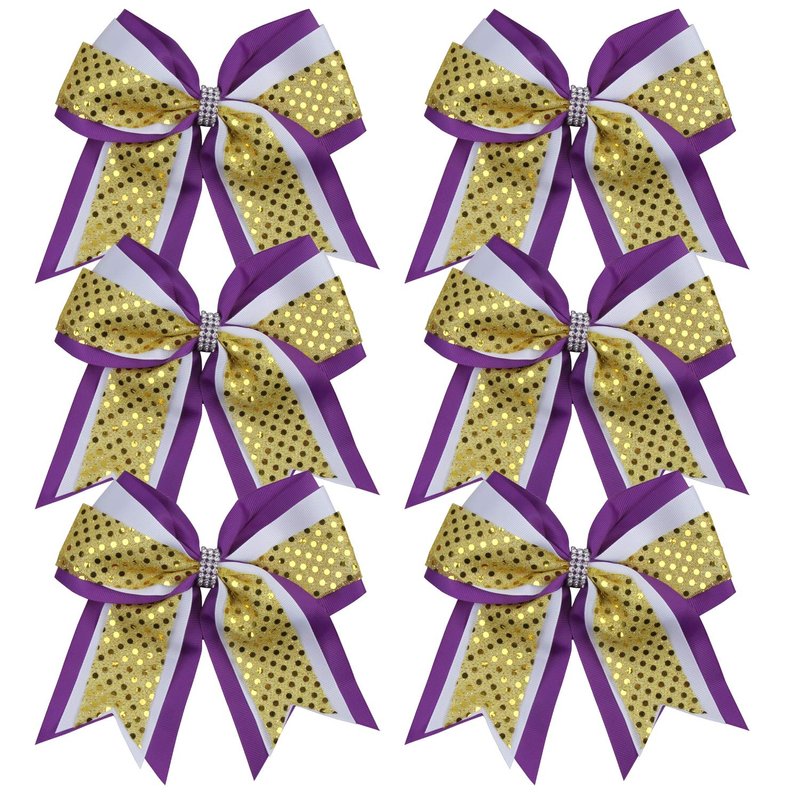 Cheerleader Bows 8 Inch 3 Layers 6 Pcs Ponytail Holder Jumbo Cheerleading Bows Hair Elastic Hair Tie for High School College (Purple/White/Gold)