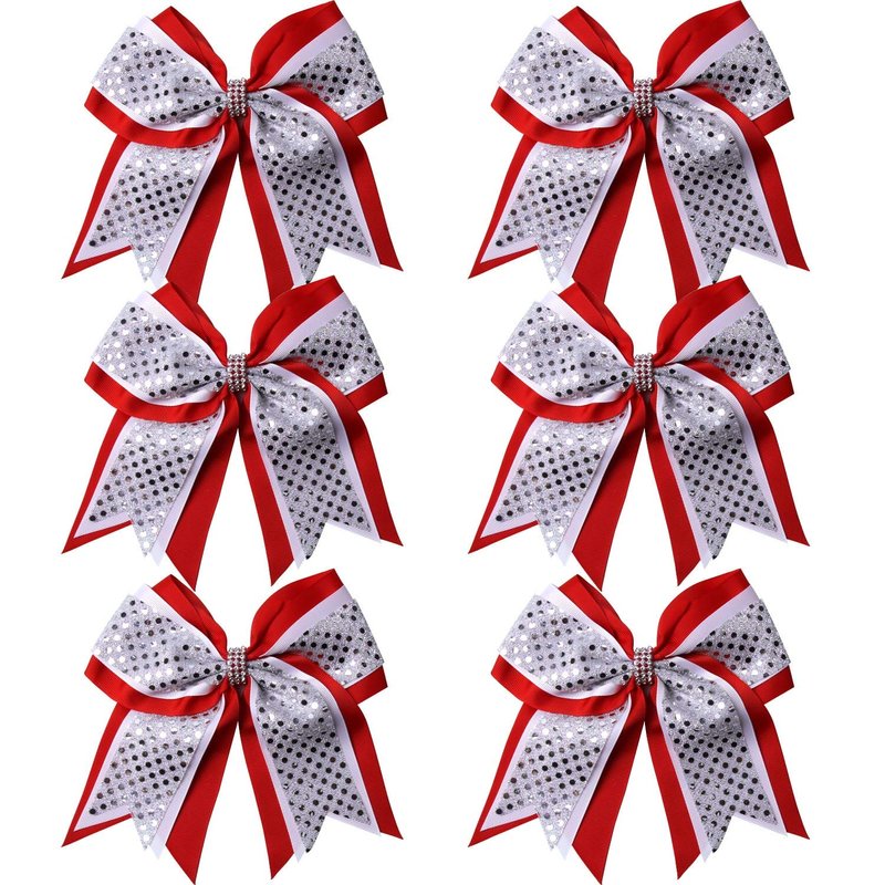 Cheerleader Bows 8 Inch 3 Layers 6 Pcs Ponytail Holder Jumbo Cheerleading Bows Hair Elastic Hair Tie for High School College (Red/White/Silver)