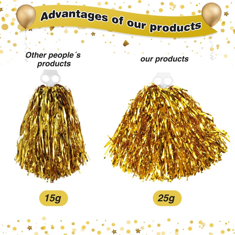 - Nice Cheering Accessories: these gold pom poms can be served as ideal accessories, for you to cheer on the athletes, to show the team spirit, infect the audience, and add a warm and exciting atmosphere to the game scene