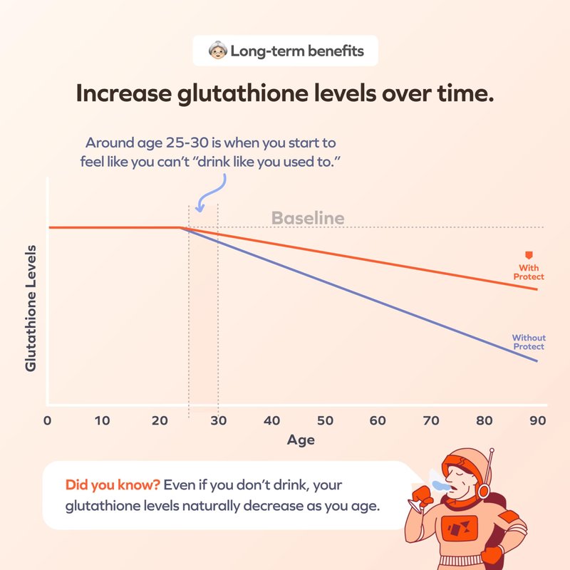 - Master antioxidant: Glutathione is known as the “master antioxidant”, tirelessly working to neutralize toxic substances. For example, consuming alcohol creates oxidation and temporarily drops your glutathione levels, making it more difficult for your liver to process those toxins. Additionally, as you age, your glutathione levels naturally decrease. Taking a daily dose of Cheers Protect will increase your glutathione levels so that your liver can process toxins more effectively.