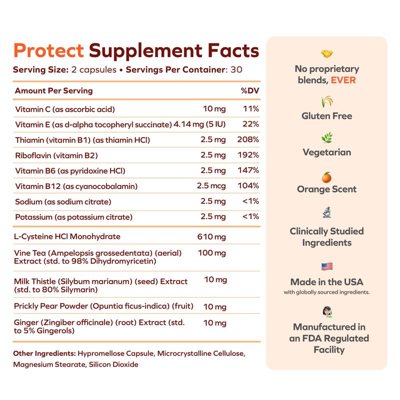 - Powerful ingredients: Our liver capsules contain powerful ingredients like Cysteine, milk thistle extract, ginger extract, DHM, Vitamin C, Vitamin E, Vitamin B1, Vitamin B2, Vitamin B6, Potassium, & more. No need for a separate ginger supplement or milk thistle capsules when you have all you need in Cheers Protect.
