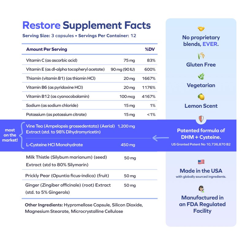 - BENEFITS YOU CAN FEEL: For next-day recovery, our capsules use a patented blend of DHM + Cysteine to tackle acetaldehyde exposure and GABA rebound — the main reasons why you feel bad after drinking.