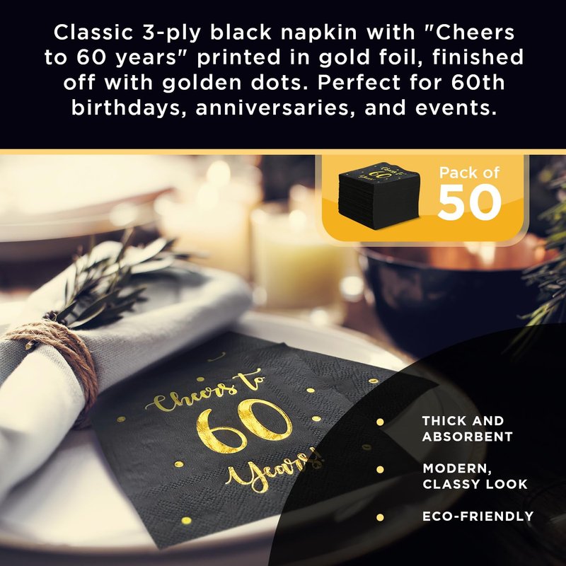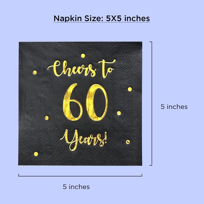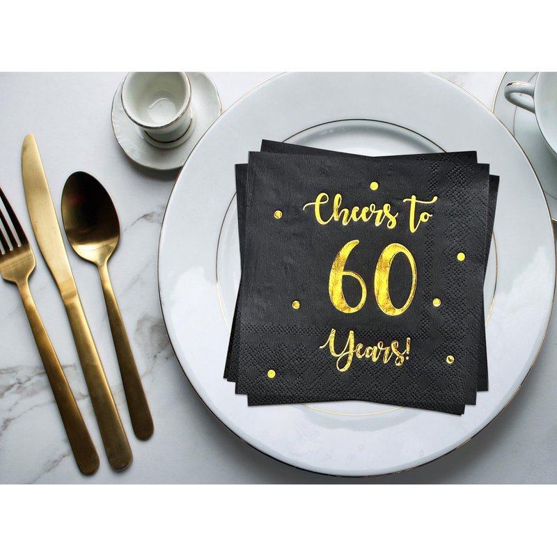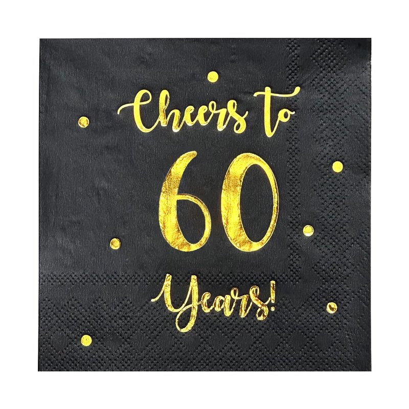 - SET INCLUDES: 50 premium quality black paper napkins with classic "Cheers to 60 years" gold foil text and dots. 60 year celebrations happen once in a lifetime, celebrate them with good taste!
