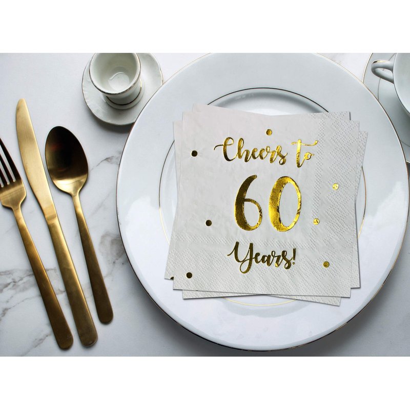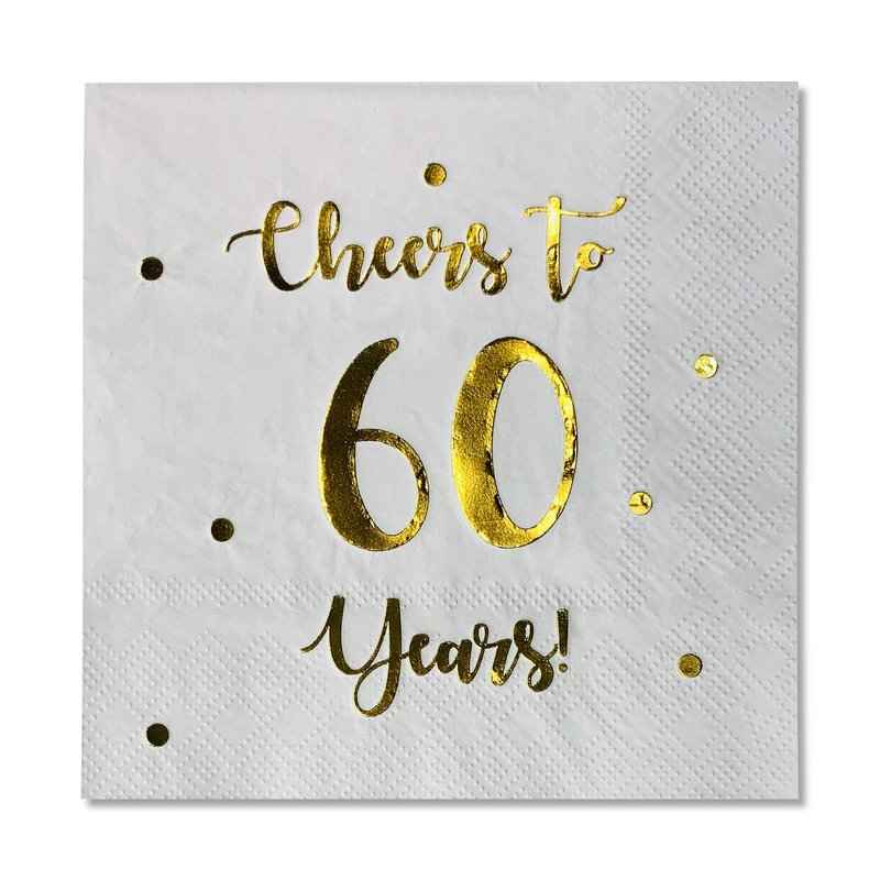 - SET INCLUDES: 50 premium quality white paper napkins with classic "Cheers to 60 years" gold foil text and dots. 60 year celebrations happen once in a lifetime, celebrate them with good taste!