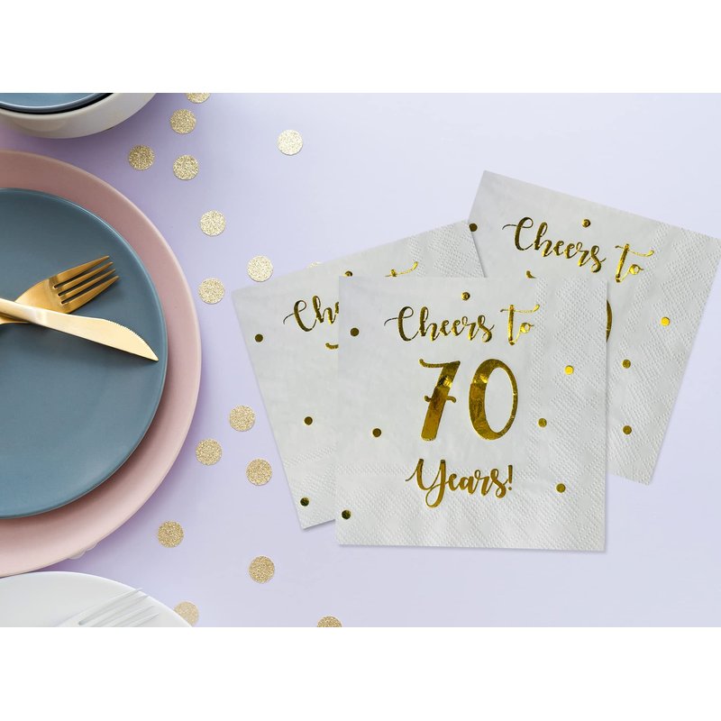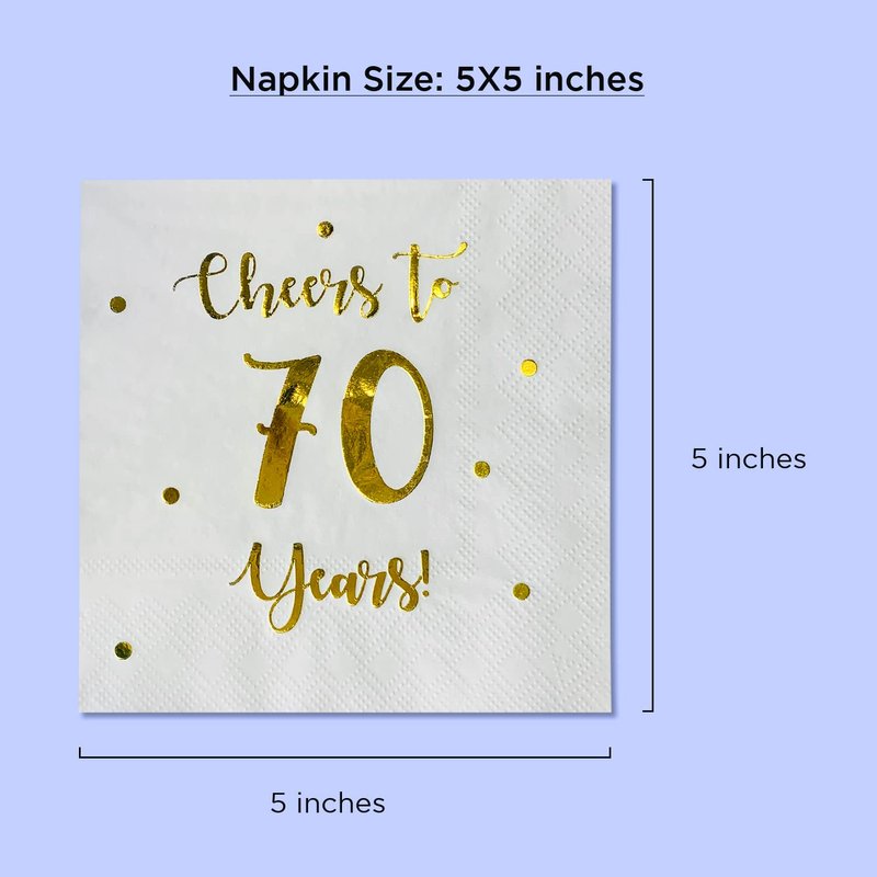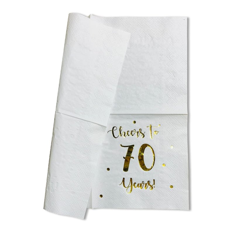 - SET INCLUDES: 50 premium quality white paper napkins with classic "Cheers to 70 years" gold foil text and dots. 70 year celebrations happen once in a lifetime, celebrate them with good taste!