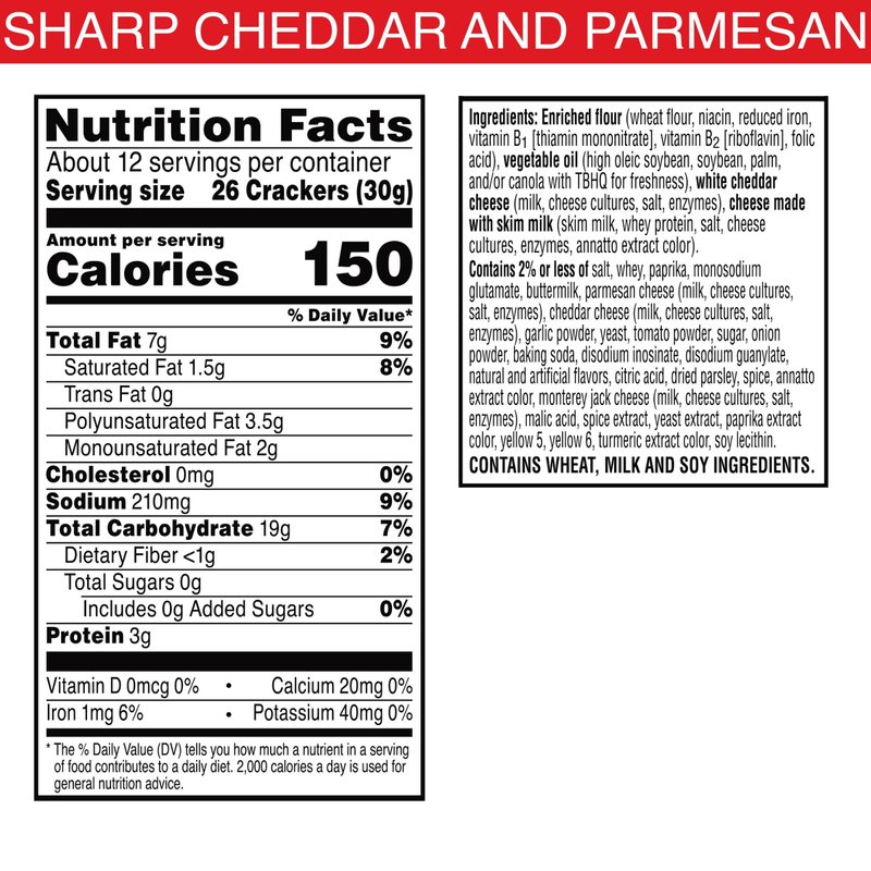 - Two is better than one; This duo-flavor box contains both Cheez-It Sharp Cheddar and Cheez-It Parmesan baked snack crackers