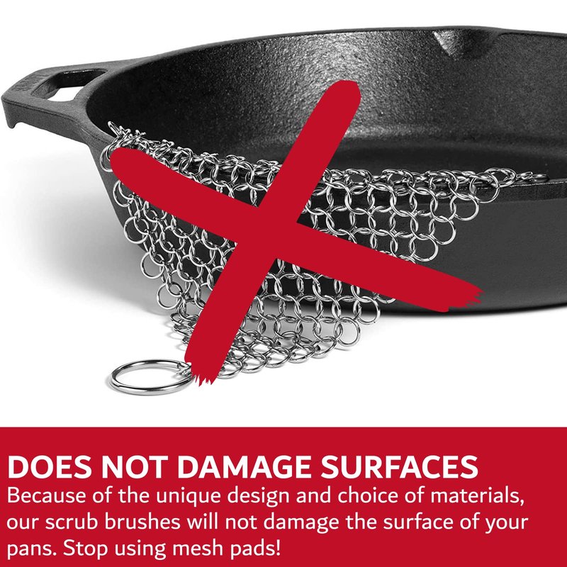 - DOES NOT DAMAGE SURFACES - Because of the unique design and choice of materials, our scrub brushes will not damage the surface of your pans. It is even safe to use on cast iron. Stop using mesh pads!