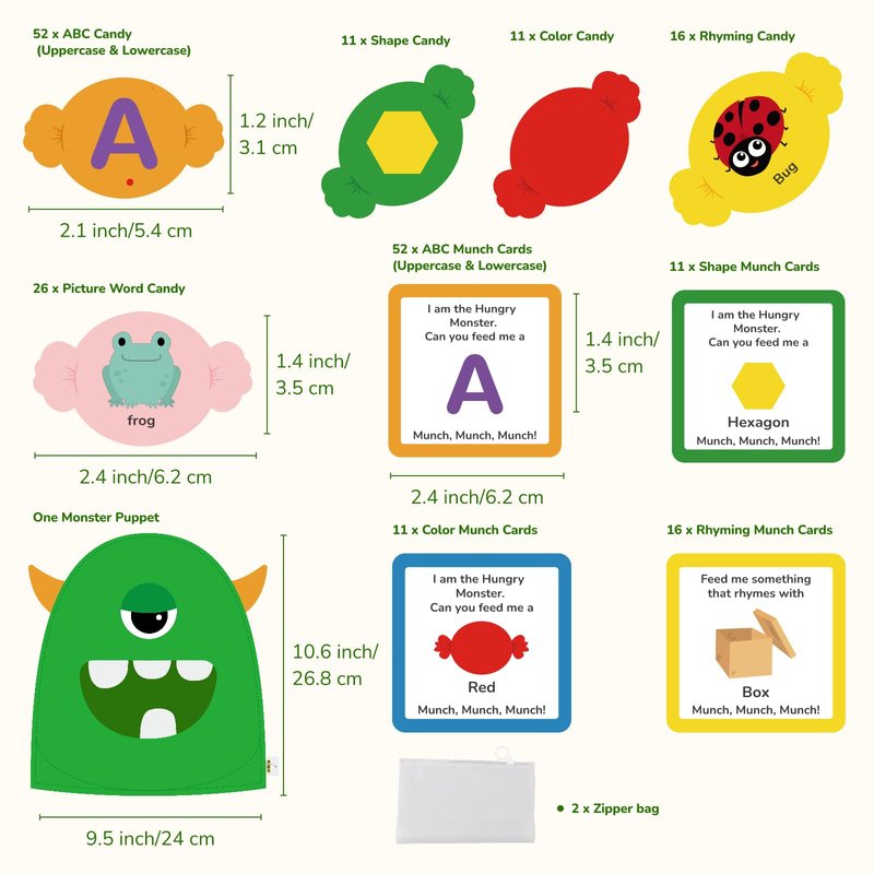 - What will you get:You will receive a little monster that eats candies and features square uppercase and lowercase letters. It includes matching uppercase and lowercase letters, colors, shapes, and spelling games related to basic life knowledge (such as small animals, expressions, etc.This is a very interesting early education product that combines learning and entertainment.
