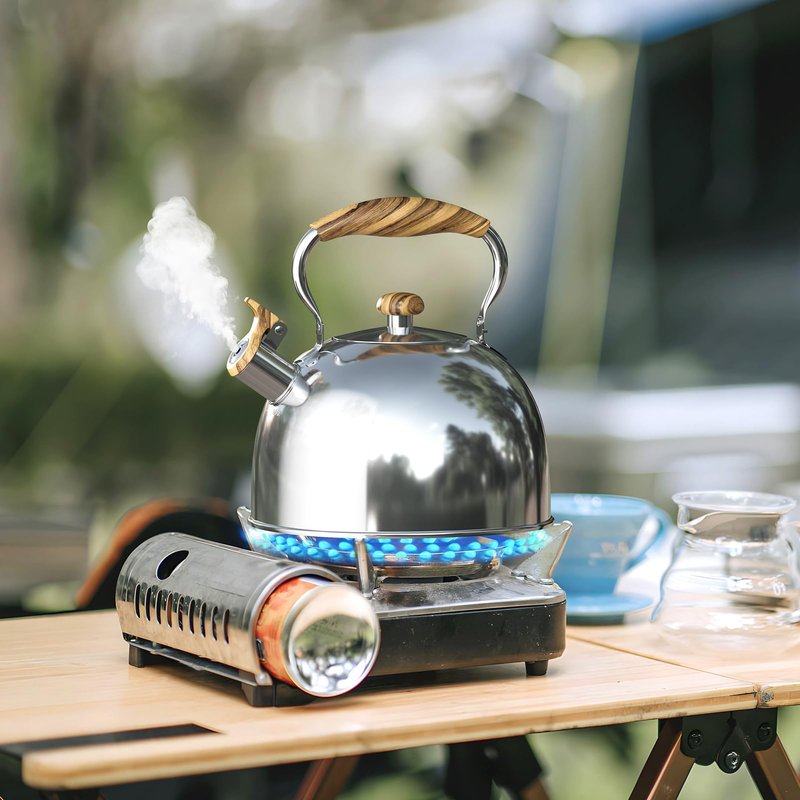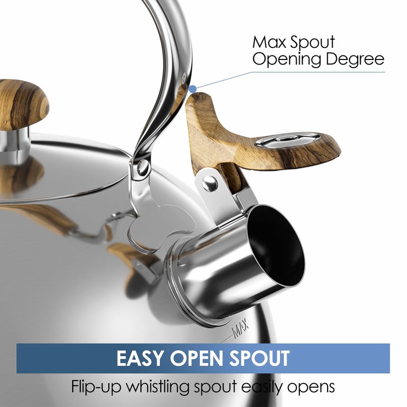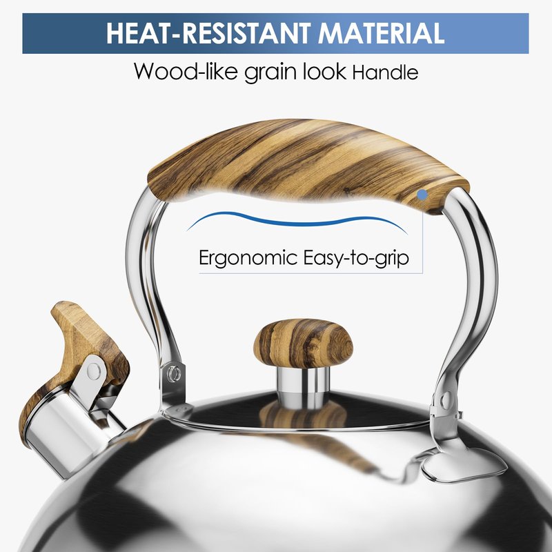 LARGE CAPACITY: This tea kettle has a large capacity of 2.5 liters/85oz, perfect for serving family and friends or making multiple cups of coffee or tea.PREMIUM QUALITY & PERFECT SIZE: This tea kettle is made of premium 304 food grade stainless steel, making it more durable and rust resistant, yet still light-weighted.ERGONOMIC HANDLE DESIGN: The insulated wooden pattern handle provides a safe, comfortable grip. It's easy to lift while boiling, and the slip-resistant design ensures stability when pouring. LOUD WHISTLIING: The kettle emits a loud whistle when the water boils to prevent it from boiling dry. Make sure the water level is below the Max waterline. STOVE TOP KETTLE: This Whistling Tea Kettle is suitable for induction cookers, and electric, gas, and natural gas stovetops. Use it over low to medium heat for quick heating and energy savings. Exercise caution with open flames.