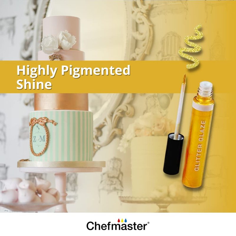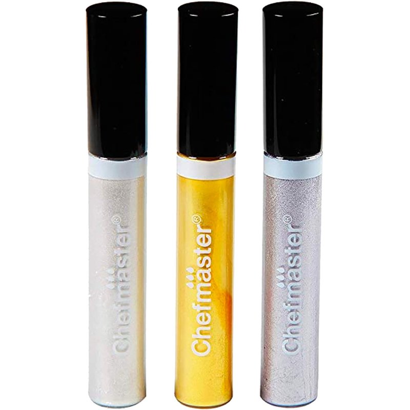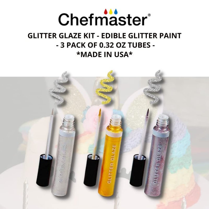 Chefmaster - Glitter Glaze Kit - Edible Glitter Paint - 3 Pack of 0.32 oz Tubes - Create Intricate Designs, Beautiful Glitter and Pearl Sheen, Pen-Sized Bottle With Brush Application - Made in the USA