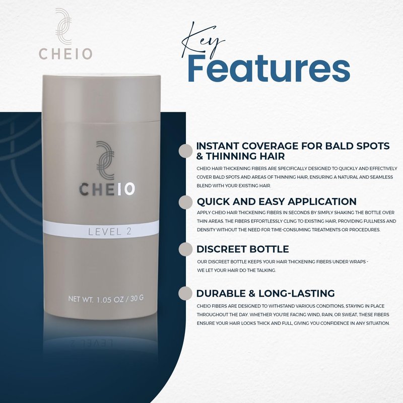 - Discreet Bottle: Cheio Hair Thickening Fibers come in a discreet bottle that doesn't draw attention to its purpose. Have confidence leaving your Cheio Hair Thickening Fibers on the counter without fear of embarrassment.