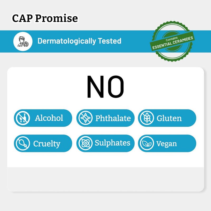 - CAP Promise : Vegan, Cruelty-Free, Phthalate Free, Sulphate-free, Alcohol-Free, Gluten-Free, Triclosan-Free