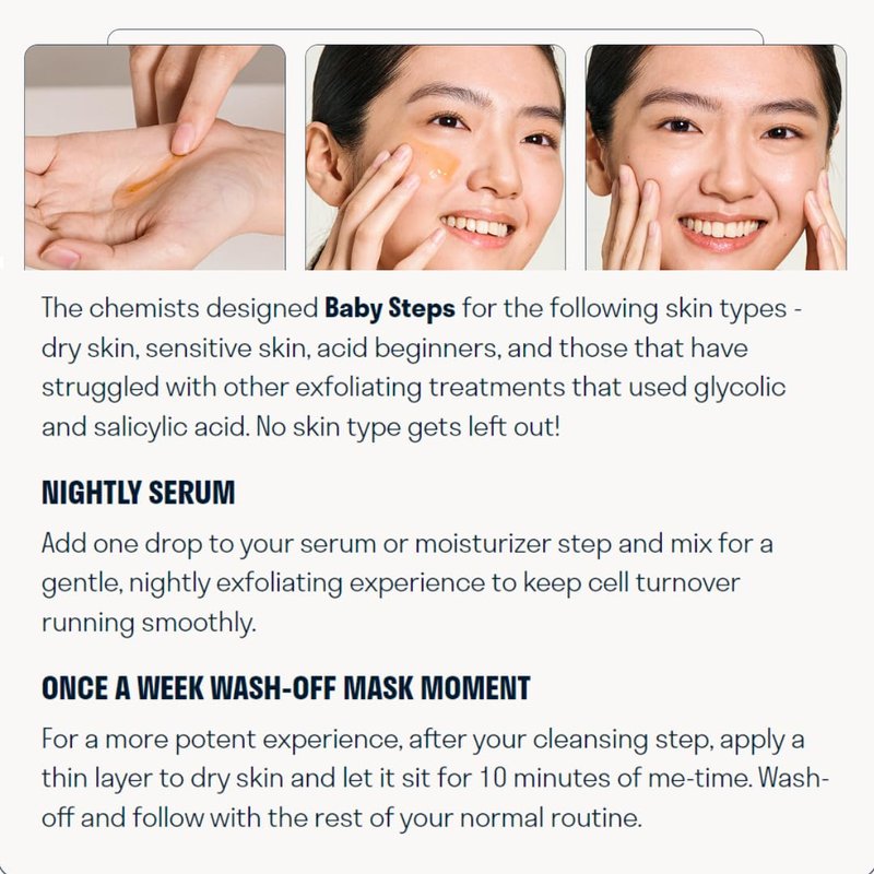 - DRY & SENSITIVE SKIN: Specially designed for sensitive skin, Baby Steps offers a mild yet transformative exfoliation experience.