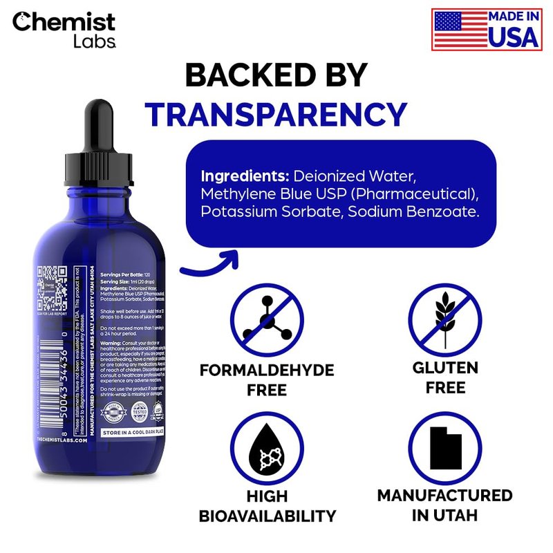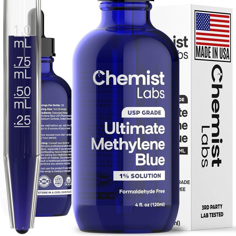 Chemist Labs 1% Methylene Blue Drops Pharmaceutical Grade 99% Purity USP Grade, Blue Methylene, Cellular & Mitochondrial Support, Third-Party Tested, Made in USA, 4oz