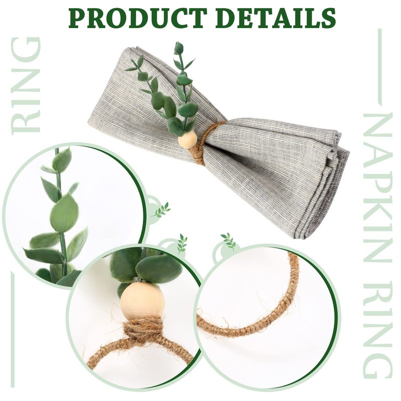- Long Serving Time: the beads on the napkin rings are made of solid wood material, you don't have to worry about it oxidizing and turning black, the green eucalyptus leaves are made of faux eucalyptus leaves, realistic and soft, won't scratch your napkin, and the part that covers napkin is natural twine rope, can serve you for a long time