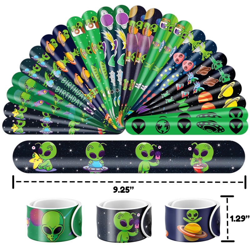 - šćEFFORTLESSLY STYLISHć: Embrace the simplicity and trendiness of wearing our slap bracelets. With just a gentle "slap," they wrap around your wrist effortlessly, creating a comfortable and stylish look. Lightweight and comfortable for extended wear, they're perfect for parties, special occasions, or everyday fashion. These accessories bring a playful charm to any gathering, capturing the joyful spirit of the ALIEN theme. Let the festivities begin!