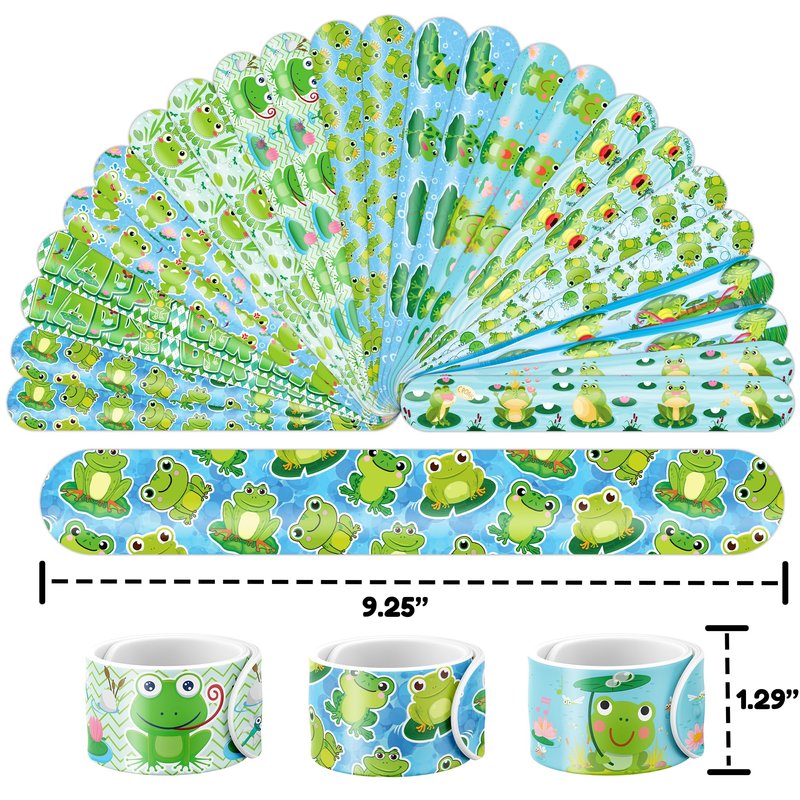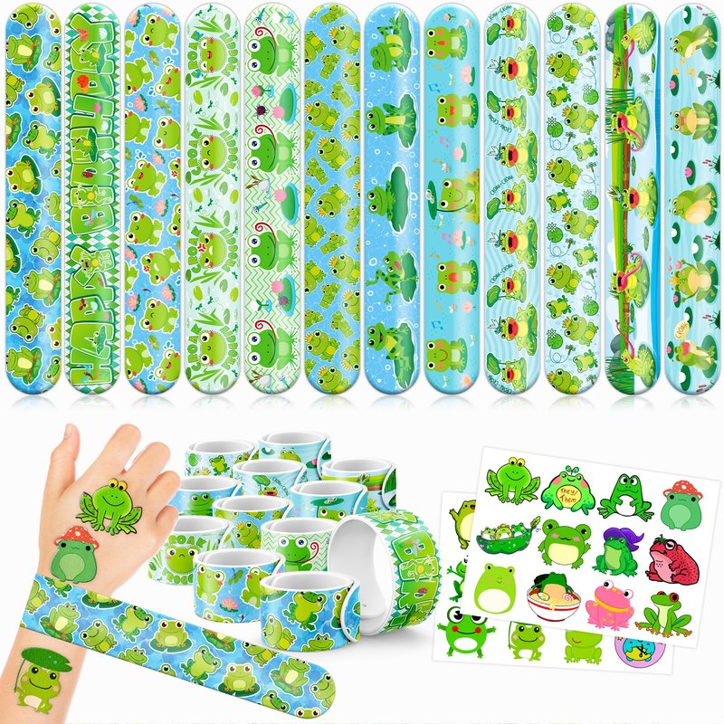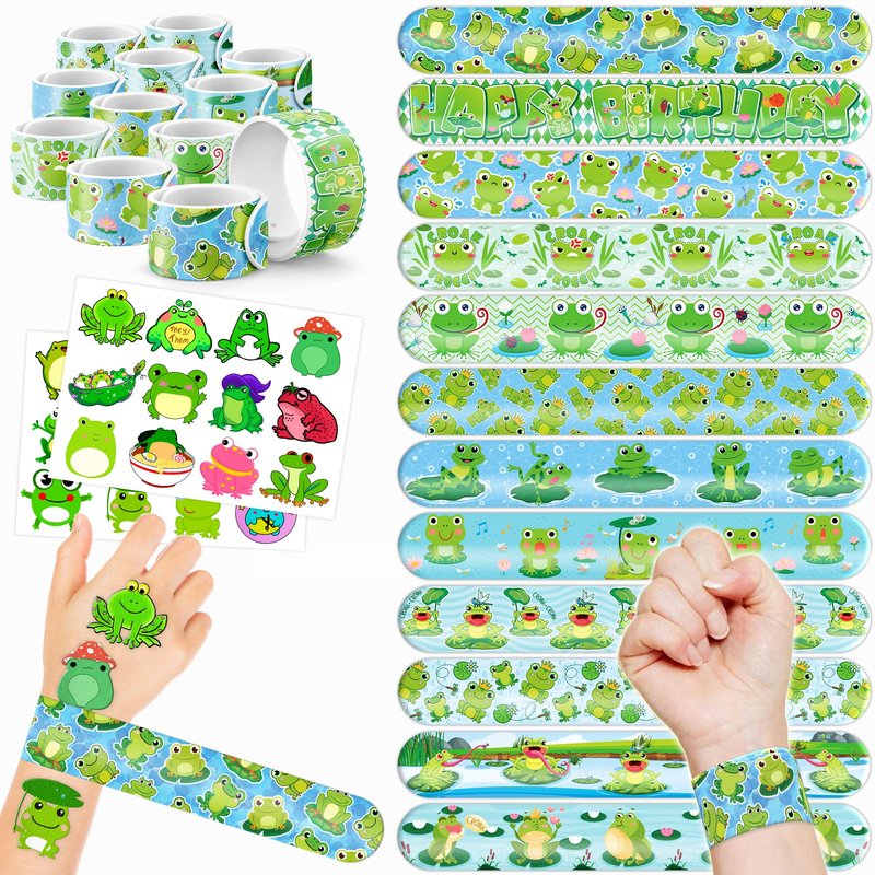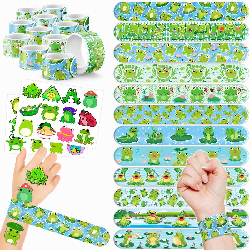 - 🥳🐸【DELIGHTFUL FROG PARTY FAVORS BUNDLE】: Get ready for laughter with our set of 24 temporary tattoo stickers and 24 slap bracelets. Each piece showcases vibrant and adorable designs inspired by the FROG, animal theme. Perfect for both kids and adults, this bundle ensures endless fun. The bracelets measure 23.5cm x 3.3cm, providing a satisfying "slapping" experience as they effortlessly wrap around your wrist.