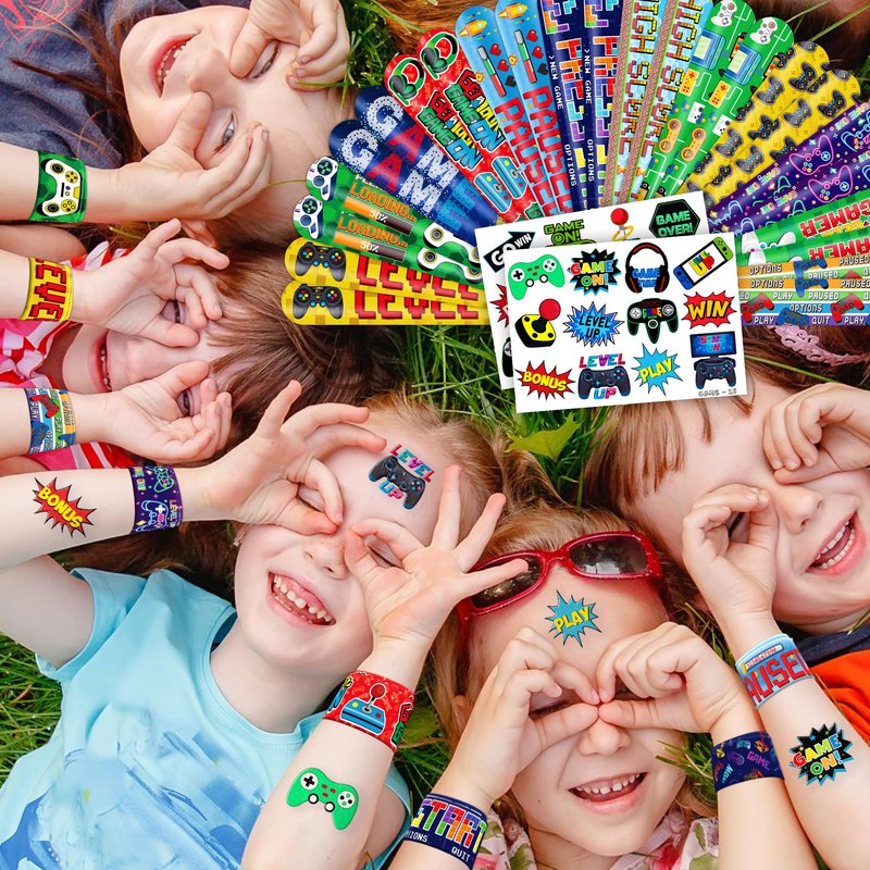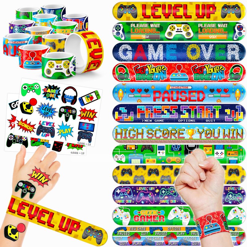 - šćPERFECT GIFT FOR GAME ENTHUSIASTSć: Our Game Temporary Tattoos and Slap Bracelets are the perfect gift for people of all ages, from kids to adults. Suitable for any occasion, they offer an affordable and delightful option. Whether for school events, birthdays, or stocking stuffers, this Gamer themed collection adds a fashionable and nostalgic element to anyone's accessory collection, invoking happiness and cherished memories.
