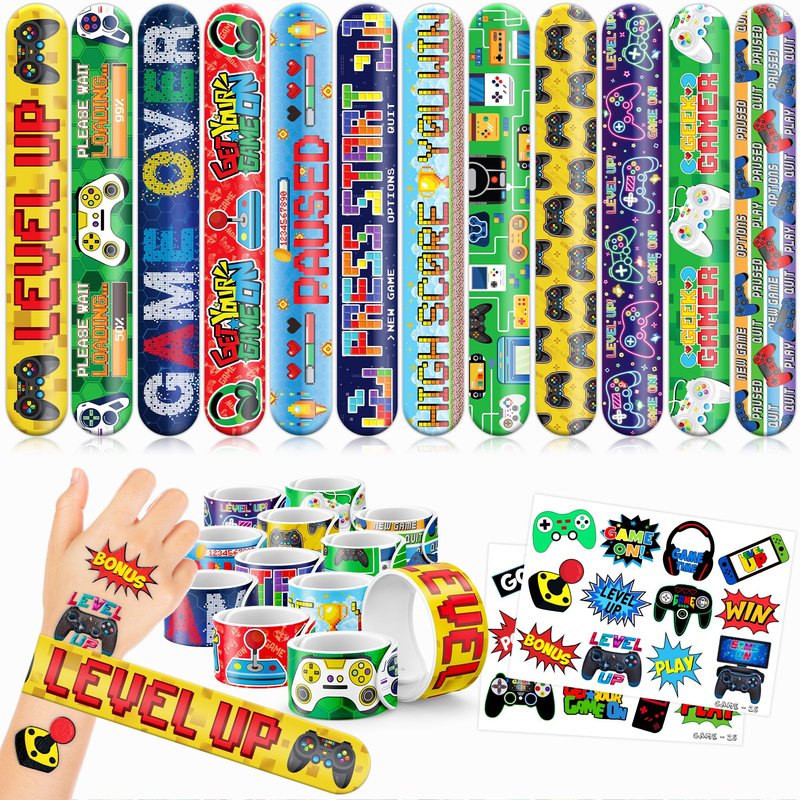 Cherisnowy 48 PCS Game Party Favors 24PCS Tattoos Sticker 24PCS Slap Bracelets Wristbands Perfect for Themed Birthday Baby Showers or Classroom Rewards Ideal Decor and Gifts for Girls and Boys