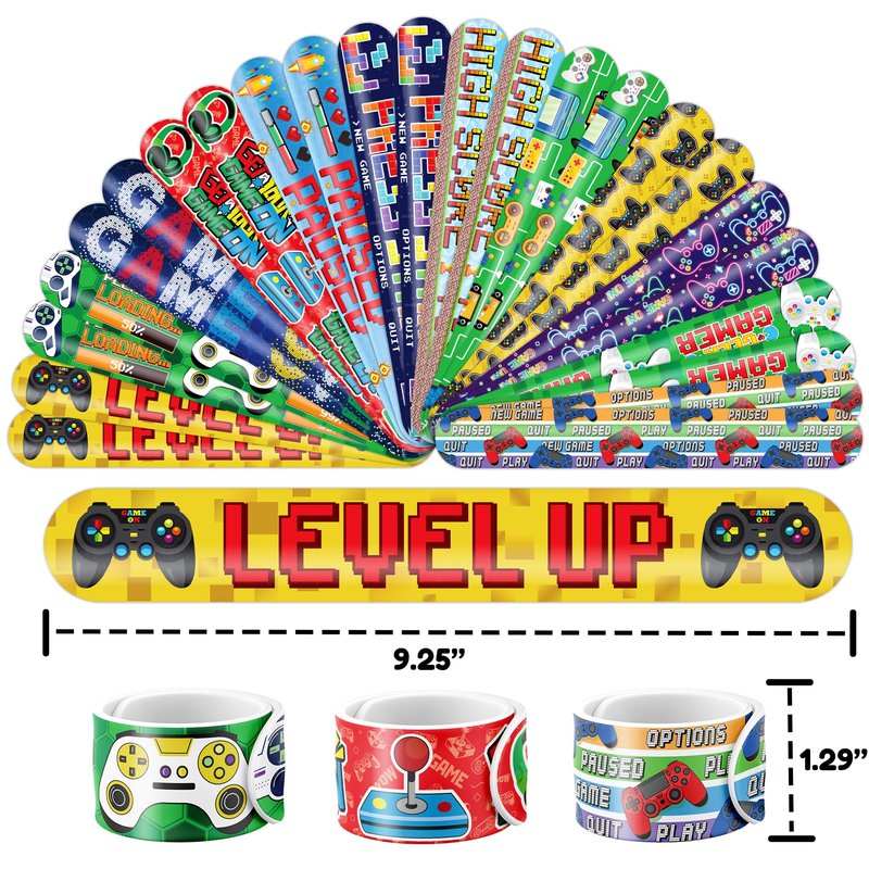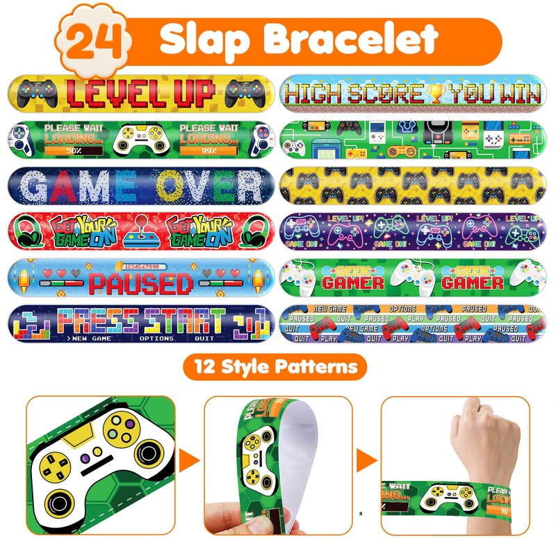 - š„³ćDELIGHTFUL GAME PARTY FAVORS BUNDLEć: Get ready for laughter with our set of 24 temporary tattoo stickers and 24 slap bracelets. Each piece showcases vibrant and adorable designs inspired by the Game theme. Perfect for both kids and adults, this bundle ensures endless fun. The bracelets measure 23.5cm x 3.3cm, providing a satisfying "slapping" experience as they effortlessly wrap around your wrist.