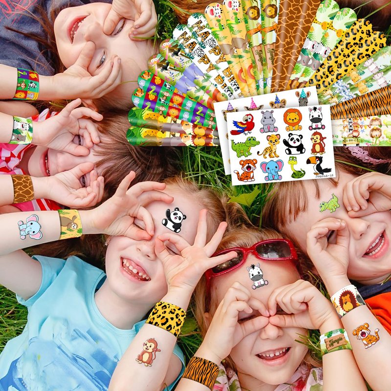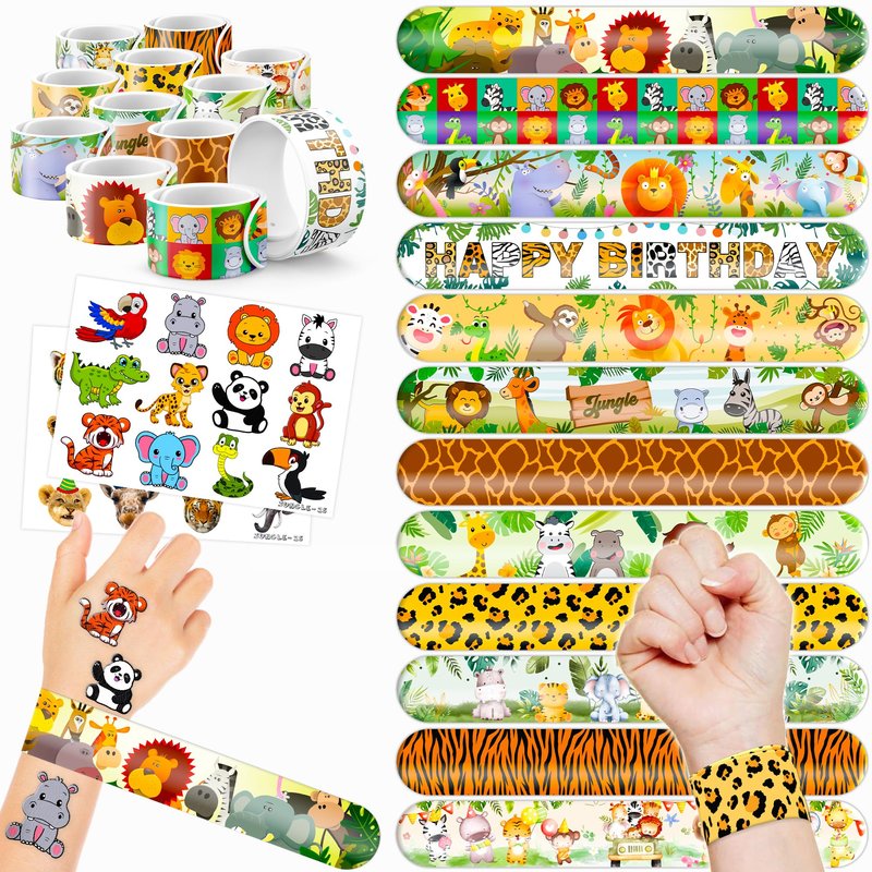 - šćPERFECT GIFT FOR JUNGLE ENTHUSIASTSć: Our Jungle Temporary Tattoos and Slap Bracelets are the perfect gift for people of all ages, from kids to adults. Suitable for any occasion, they offer an affordable and delightful option. Whether for school events, birthdays, or stocking stuffers, this Jungle themed collection adds a fashionable and nostalgic element to anyone's accessory collection, invoking happiness and cherished memories.