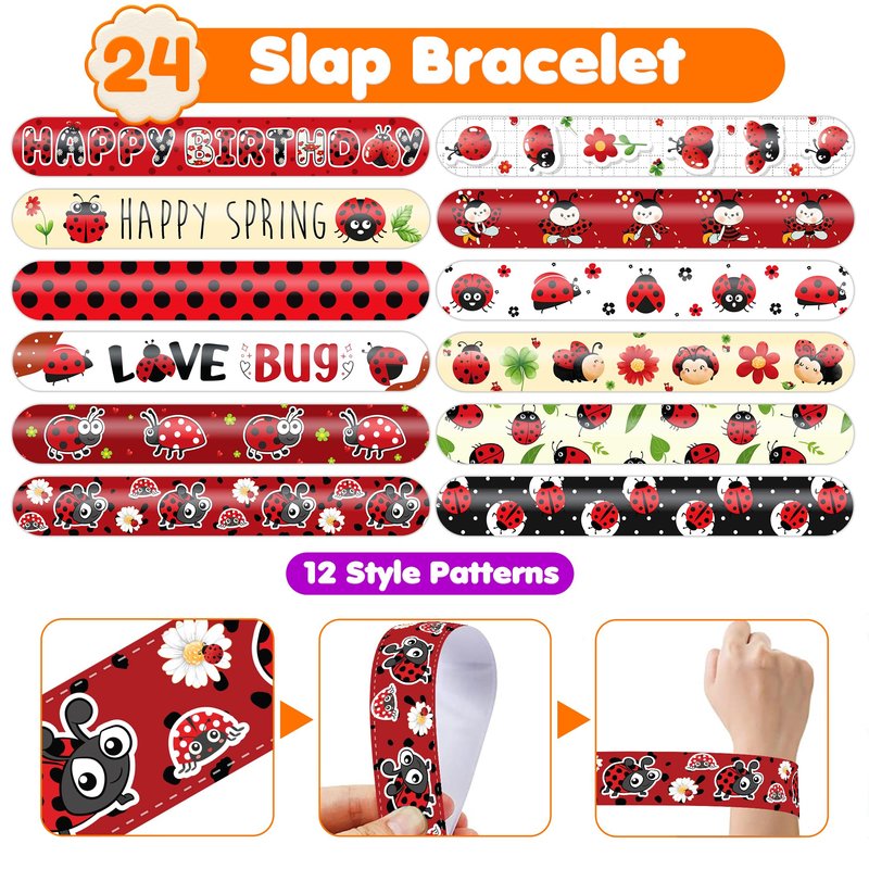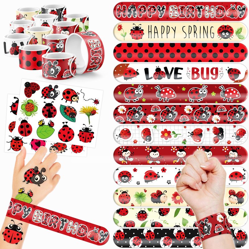 - 🥳🐞【DELIGHTFUL LADYBUG PARTY FAVORS BUNDLE】: Get ready for laughter with our set of 24 temporary tattoo stickers and 24 slap bracelets. Each piece showcases vibrant and adorable designs inspired by the LADYBUG, bug, insert theme. Perfect for both kids and adults, this bundle ensures endless fun. The bracelets measure 23.5cm x 3.3cm, providing a satisfying "slapping" experience as they effortlessly wrap around your wrist.