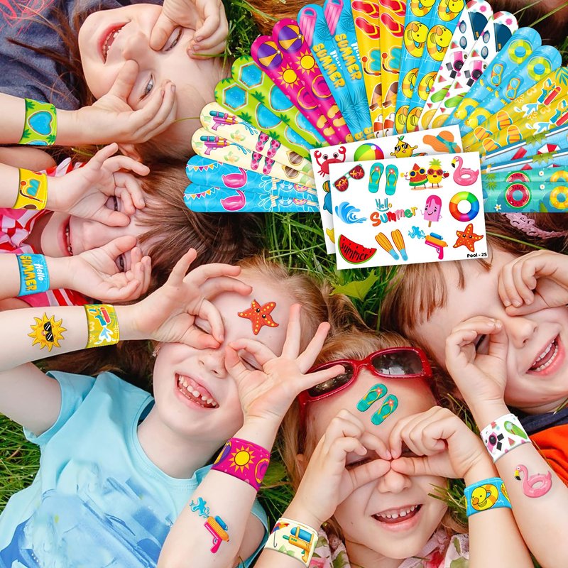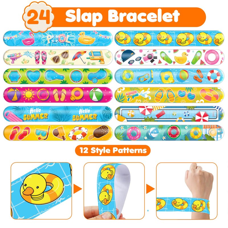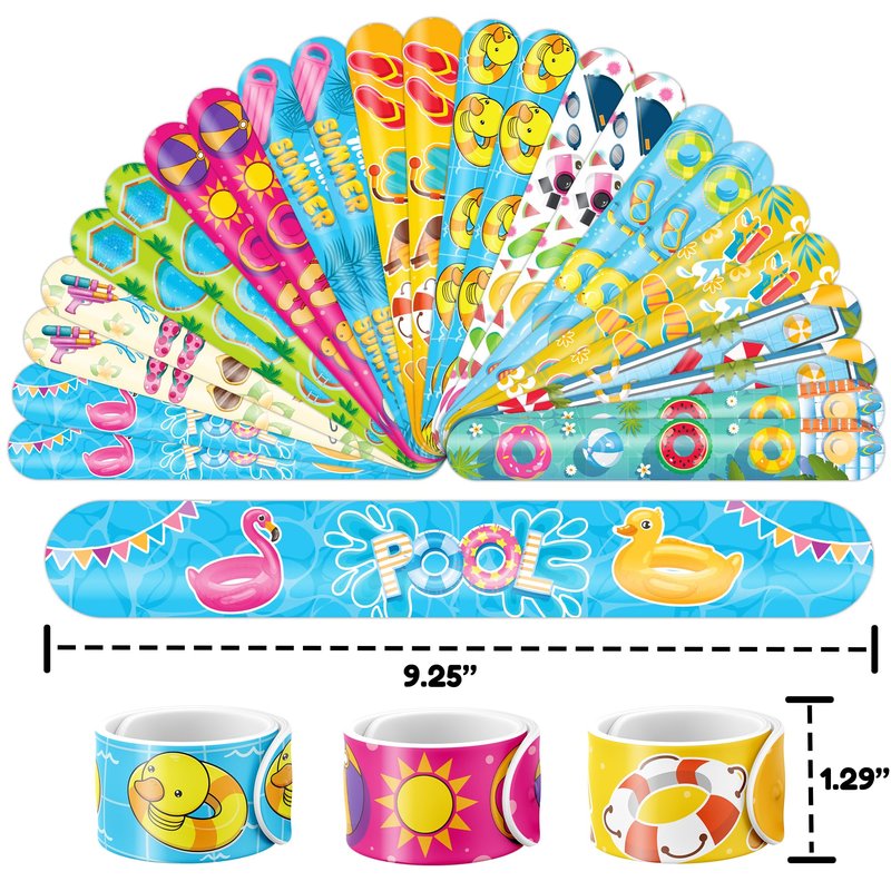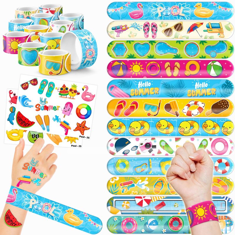 - 🥳🍹DELIGHTFUL POOL PARTY FAVORS BUNDLE】: Get ready for laughter with our set of 24 temporary tattoo stickers and 24 slap bracelets. Each piece showcases vibrant and adorable designs inspired by the Pool theme. Perfect for both kids and adults, this bundle ensures endless fun. The bracelets measure 23.5cm x 3.3cm, providing a satisfying "slapping" experience as they effortlessly wrap around your wrist.🌞