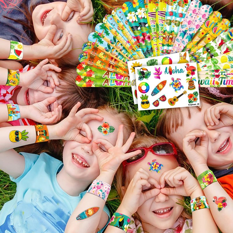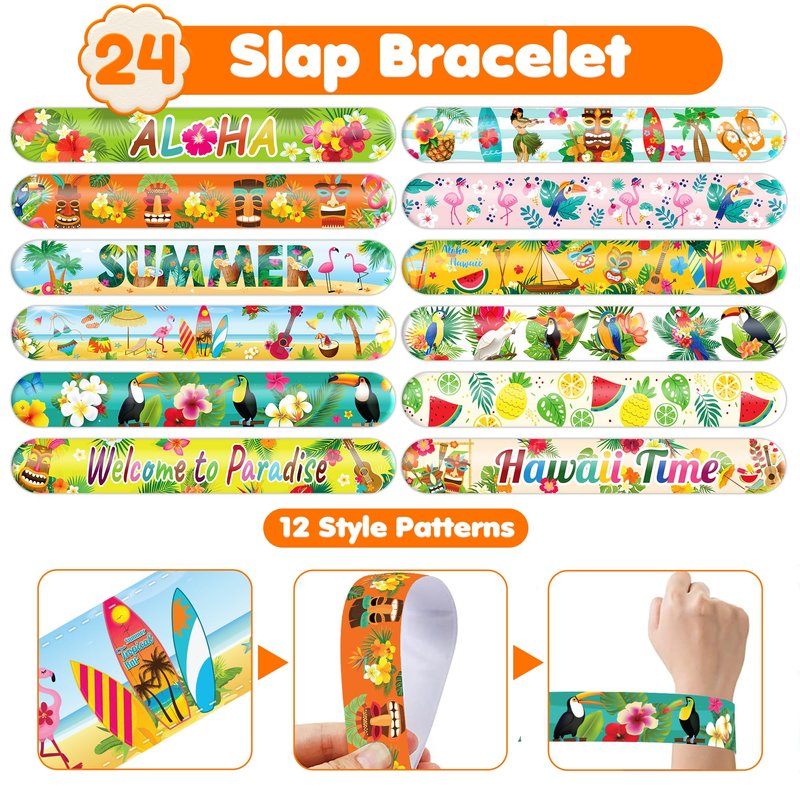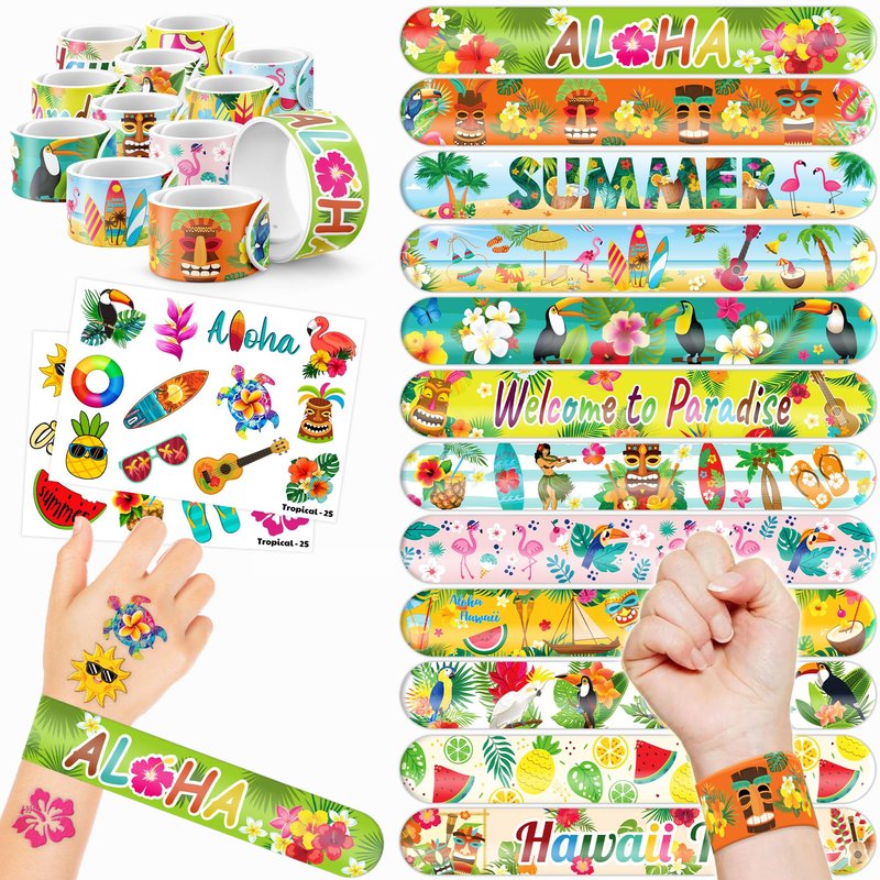 - 🥳🌴【DELIGHTFUL TROPICAL PARTY FAVORS BUNDLE】: Get ready for laughter with our set of 24 temporary tattoo stickers and 24 slap bracelets. Each piece showcases vibrant and adorable designs inspired by the Tropical theme. Perfect for both kids and adults, this bundle ensures endless fun. The bracelets measure 23.5cm x 3.3cm, providing a satisfying "slapping" experience as they effortlessly wrap around your wrist.🌊