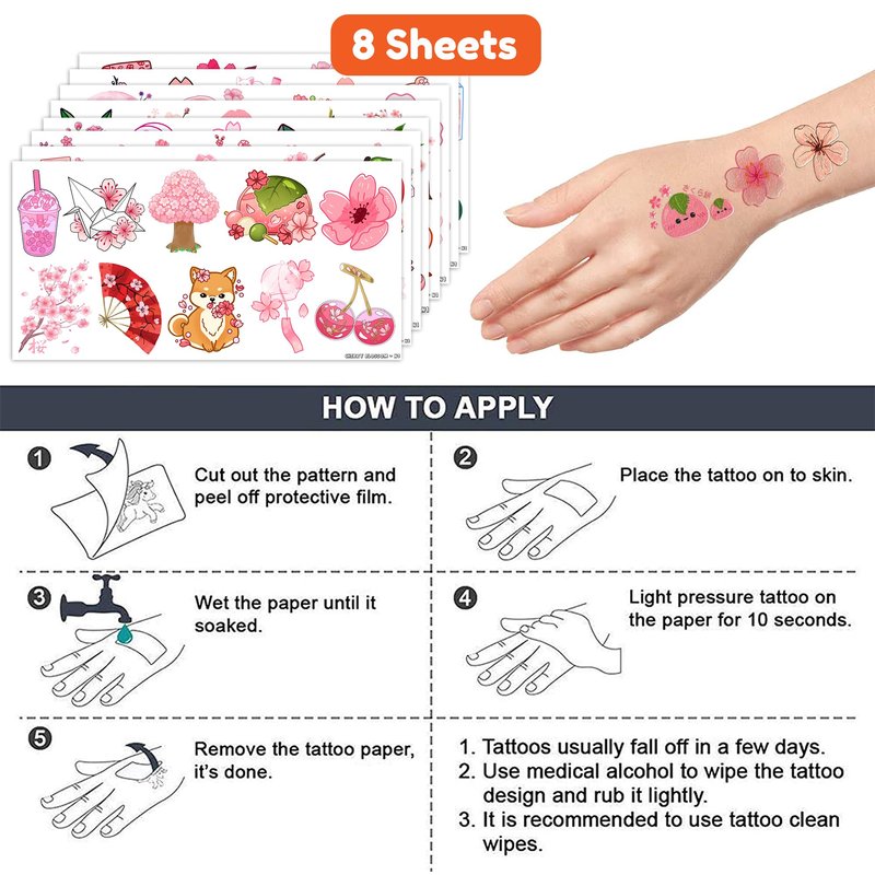 - Including 8 sheets tattoos with various styles, sufficient in quantities and colors to meet your daily requirement of using and sharing. You guys can easily use this set of Cherry Blossom temporary tattoos and take unique photos to make fond memories.