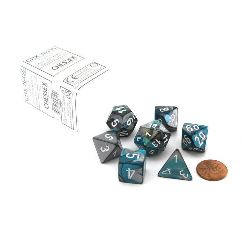 - Polyhedral 7-Die Gemini Dice Set: Steel & Teal with White (d4, d6, d8, d10, d12, d20 & d00)